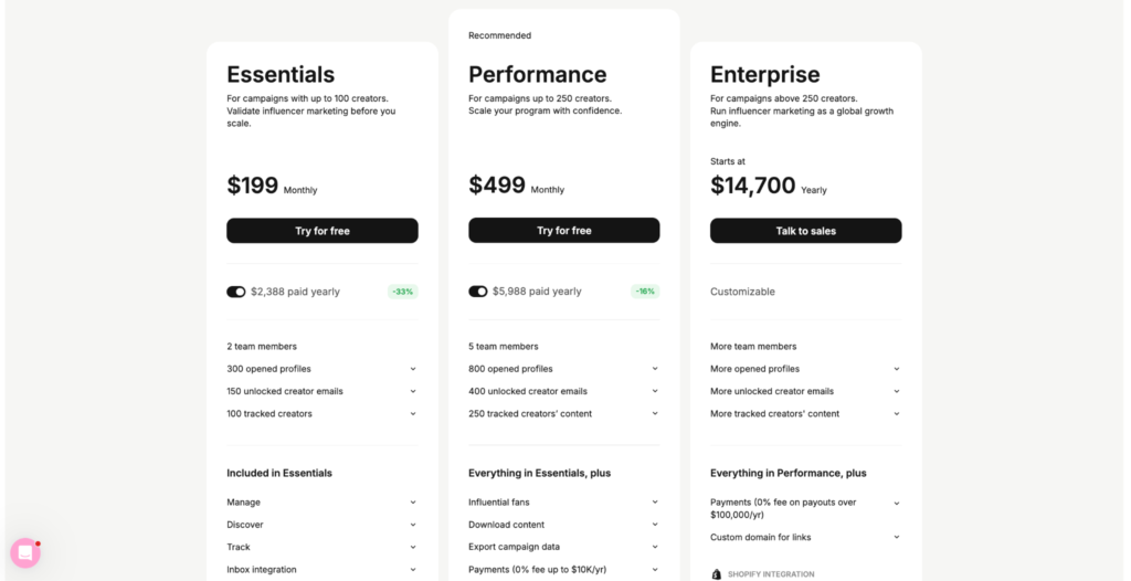 Like CreatorIQ, Captiv8 targets the mid-to-enterprise market and uses a custom pricing model: Pricing is undisclosed but tailored based on the number of seats, features, and the volume of creators managed. Expect it to be in the enterprise tier (multiple thousands per year).